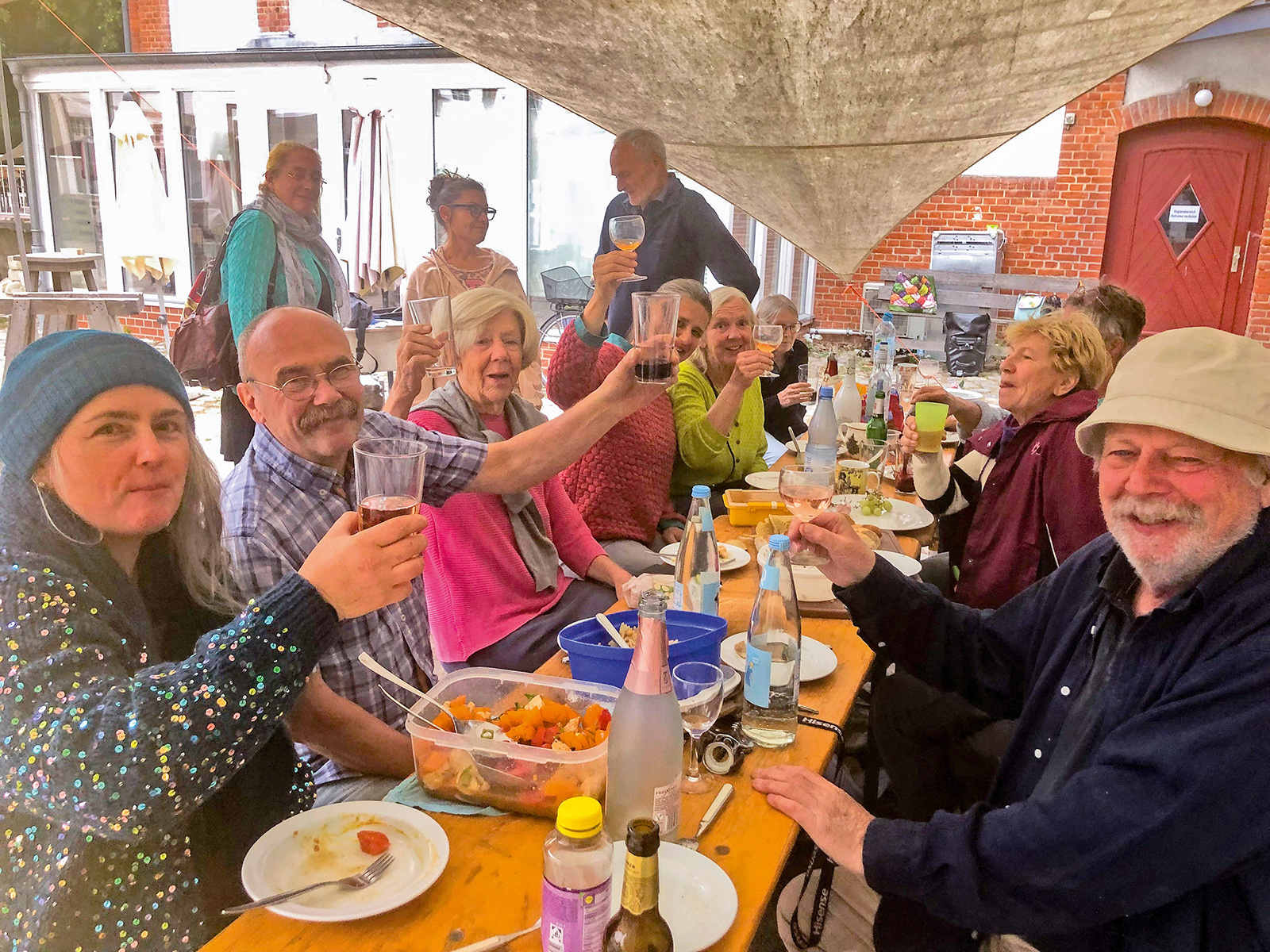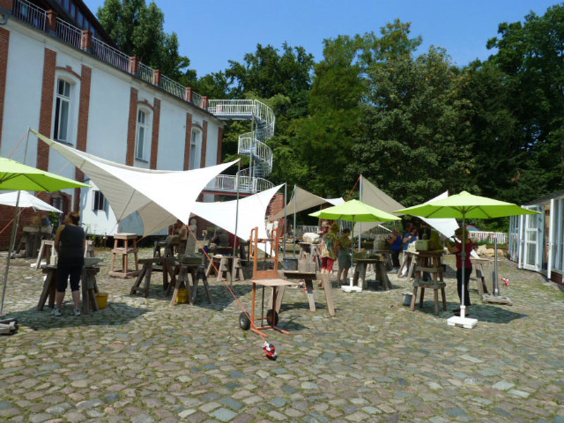 Wo einst Bier gebraut wurde, werden heute Jugendliche zu Tischlern bzw. Köchen ausgebildet. Vor der Kulisse aus roten Ziegelbauten bauen wir uns auf. Ein großes Sommersegel macht es möglich, dass wir wirklich bei jedem Wetter draußen arbeiten können.