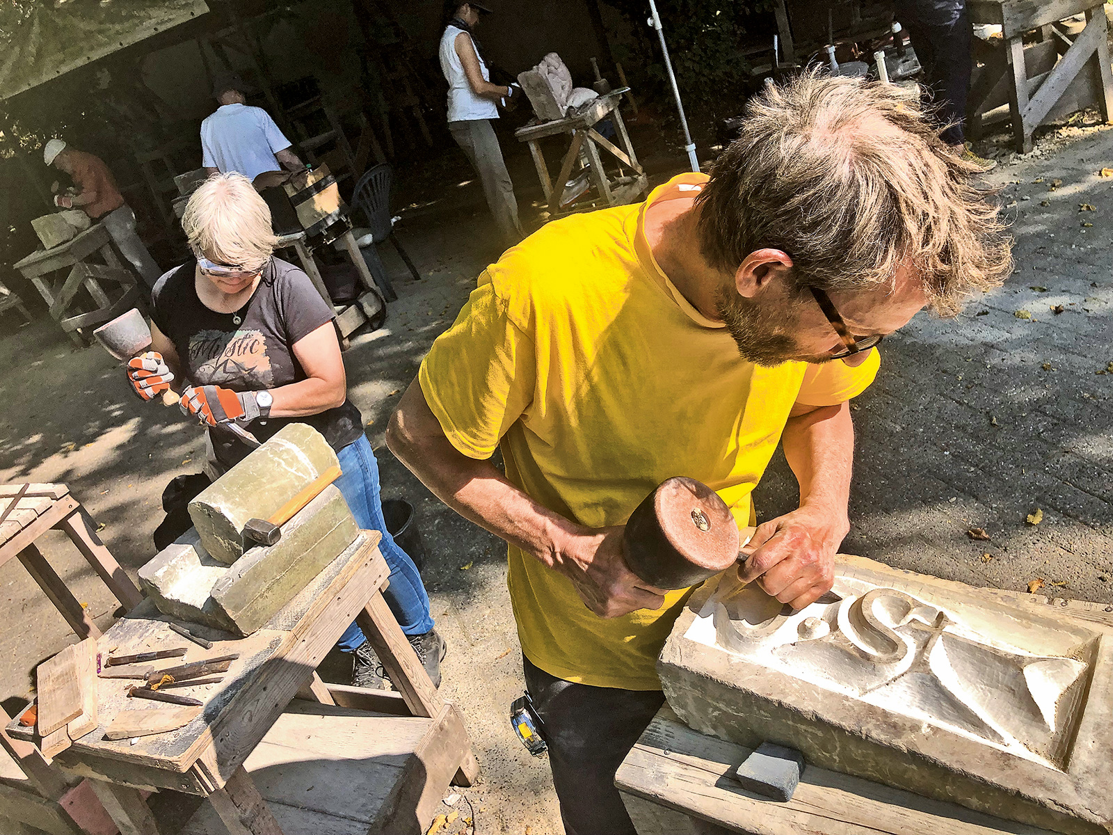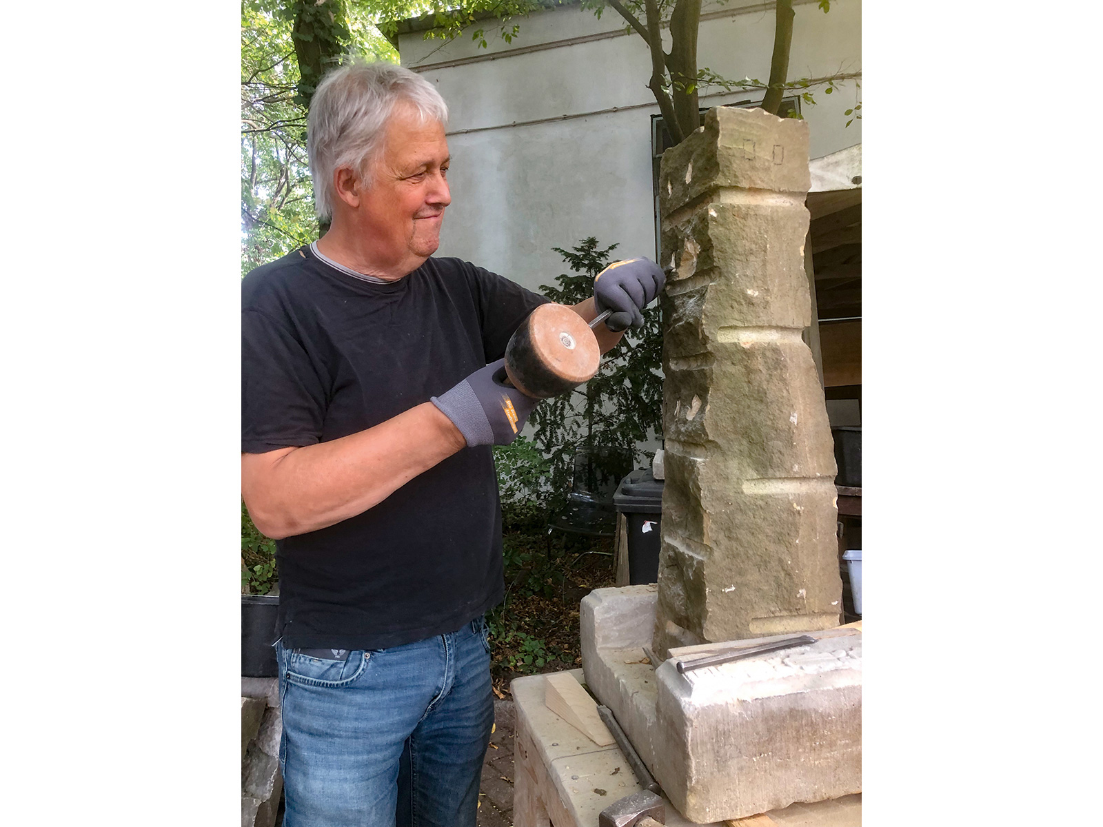Fäustel, Knüpfel, Spitz-, Zahn- und Flacheisen: Als Anfänger*in tasten Sie sich erst einmal in aller Ruhe an die Werkzeuge heran. In der Regel entwickeln sich sehr schnell ein Zugang zum Material und ein Gefühl für Ihren ausgesuchten Stein. Ich begleite Sie von Anfang an, kläre das Wie, Was und Warum und helfe auch mal ganz praktisch mit einem kräftigen Schlag bei Ihrem Stein nach.