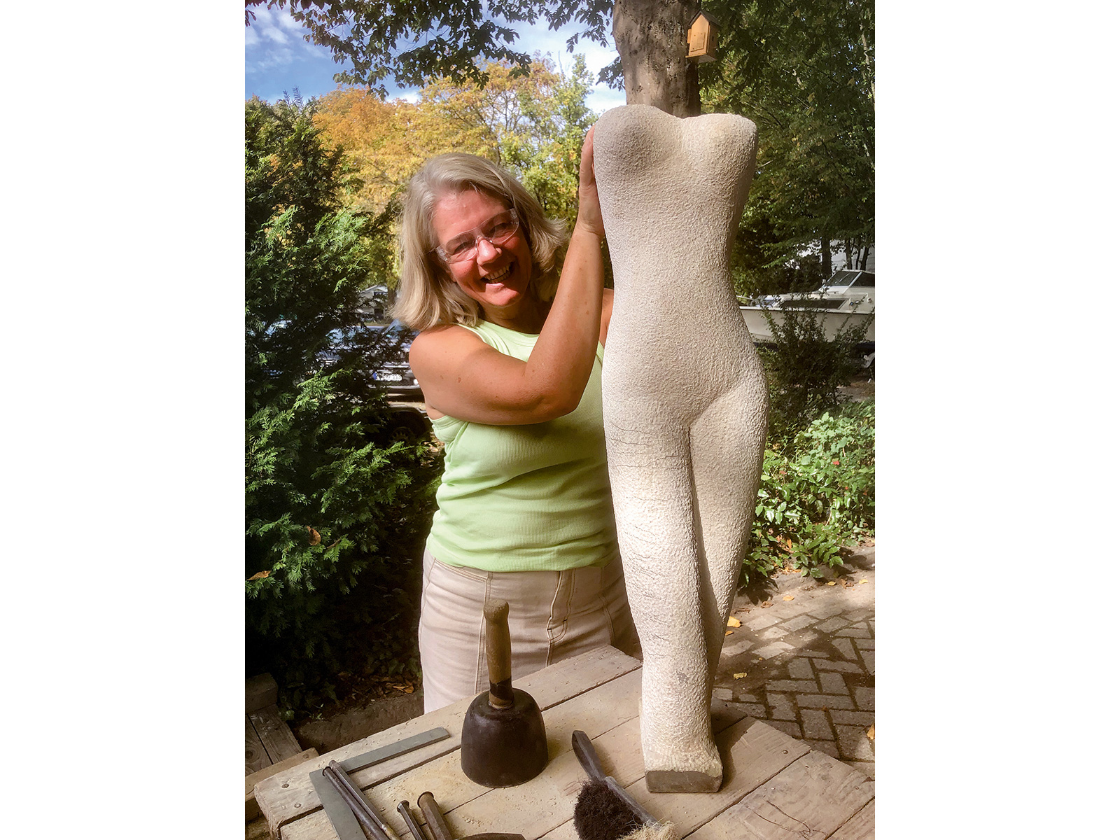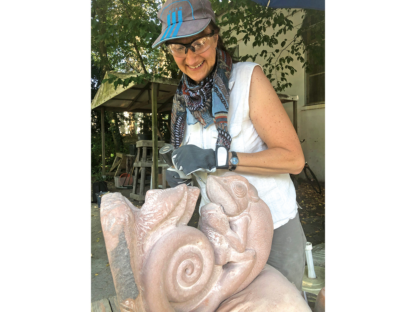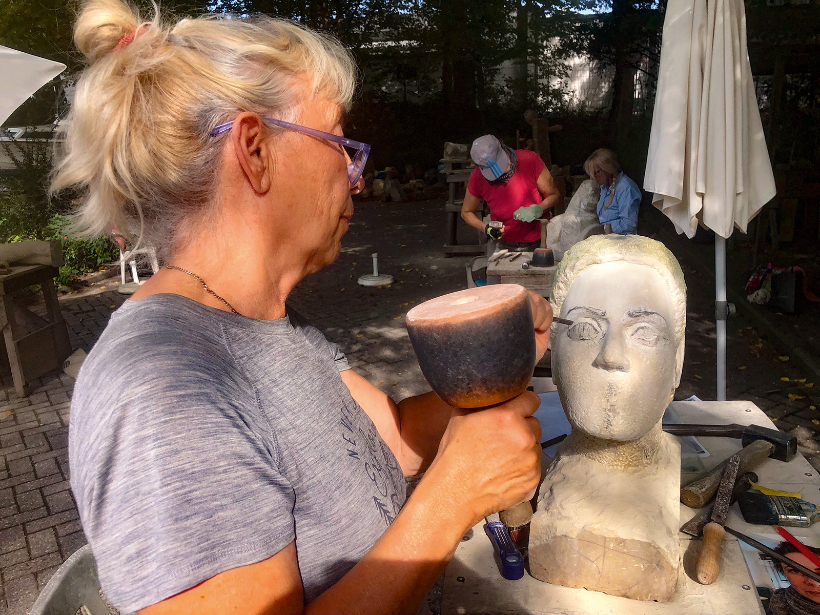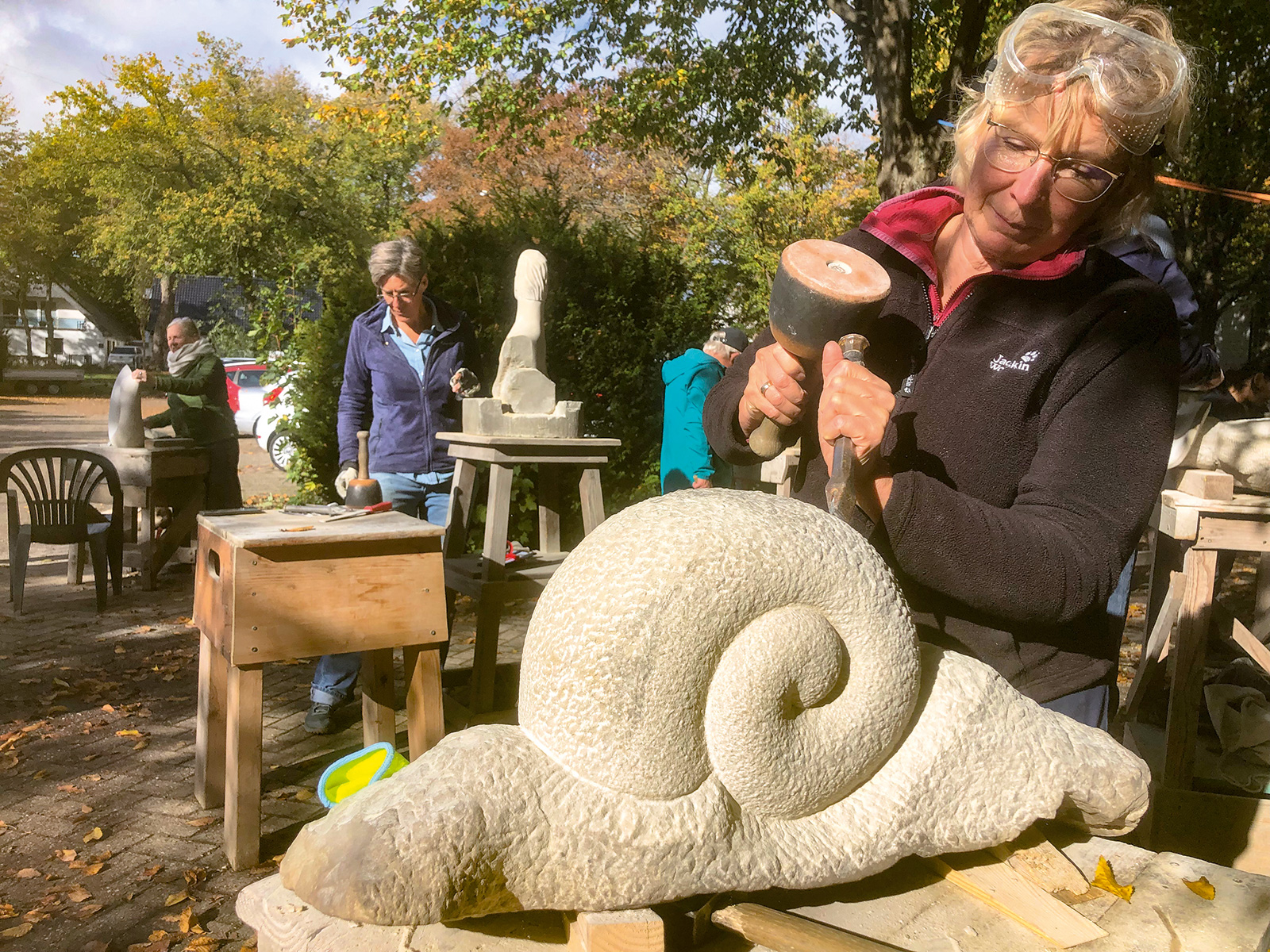 Die Kulturwerkstatt Westend in Bremen ist so etwas wie mein zweites Zuhause: Seit 1994 biete ich hier im Hof Steinbildhauerkurse an. Wir arbeiten grundsätzlich unter freiem Himmel. Die alten Bäume spenden reichlich Schatten – bei zu viel Sonne oder Regen kommen Schirme zum Einsatz. Im Haus findet immer zu Beginn unserer Kurs-Saison eine große Ausstellung statt. Hier zeigen wir alle Steinskulpturen, die in den Kursen entstanden sind und feiern anschließend, mit langem Buffet und lauter Musik.